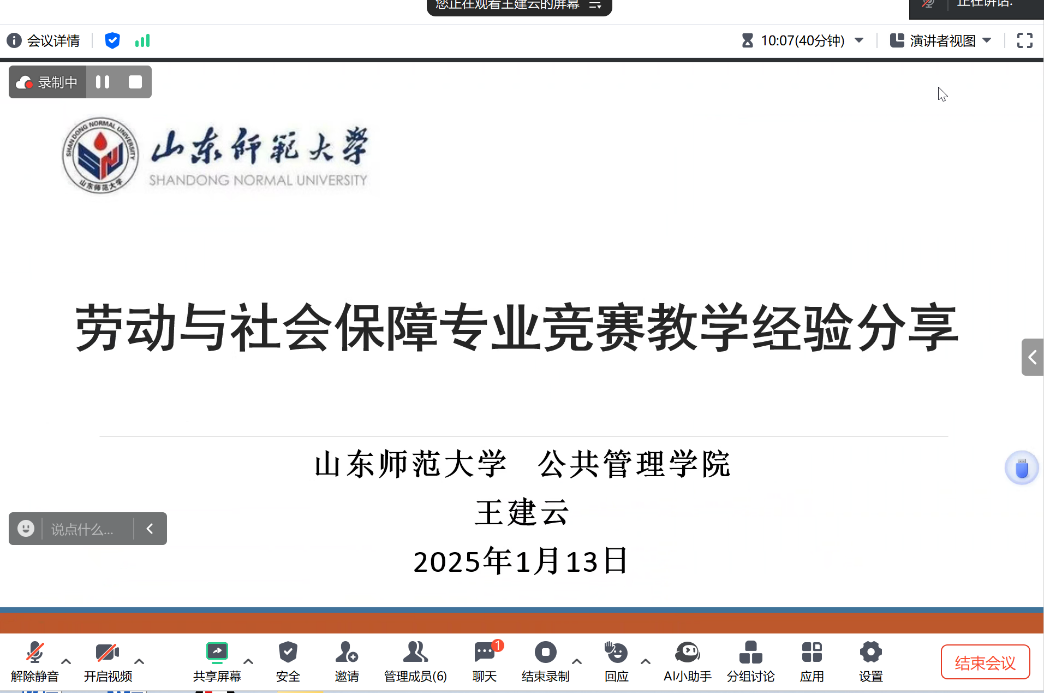 2025年1月13日下午,浙江财经大学东方学院伟德国际victor1946社保系举办了一场以“劳动与社会保障专业竞赛教学经验分享”为主题的线上讲座。本次讲座特邀山东师范大学王建云老师作为主讲嘉宾,浙江财经大学东方学院伟德国际victor1946社保系教师参与此次讲座。