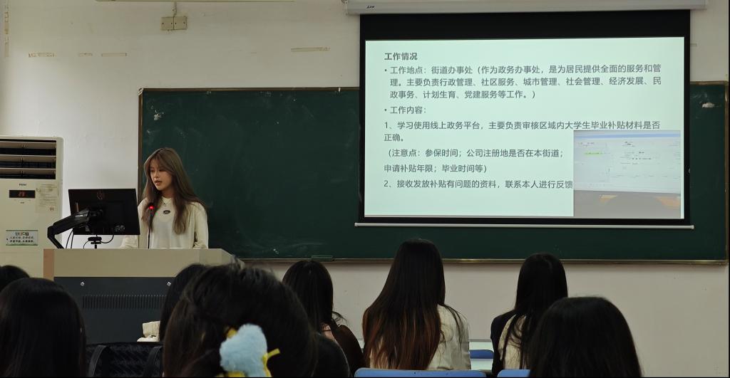 每一位同学的所见、所闻、所感,都非常真实且用心。其中一位在街道办事处实习的同学特别强调了理论联系实际的重要性。她指出,虽然在校学习提供了许多相关的理论基础,但只有通过实际接触和学习才能够有更深入认识。实习过程中,能够接触到真实的工作任务和项目,积累宝贵的工作经验,提升自己的实践能力。