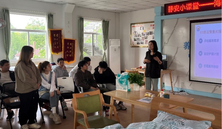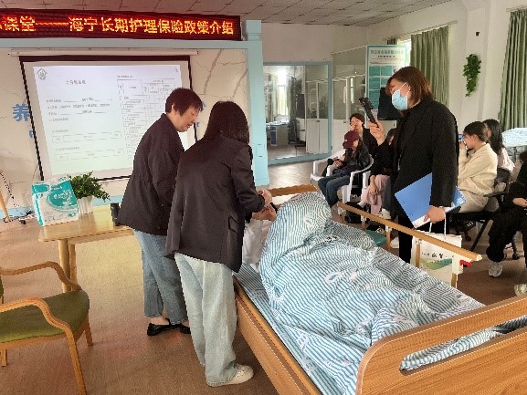 长期护理保险通过社会互助共济,可为长期失能人员的基本生活照料照护提供专业护理及资金保障,维护这部分特殊群体的基本生活权益,提升生活质量,让他们有尊严地生活,实现改革成果的共享。为了使同学们能够将课堂中学到的有关长期护理保险的理论知识与实际操作相结合,加深同学们对理论知识的深入理解和消化。近日,浙江财经大学东方学院伟德国际victor1946社保系师生与海宁市静安护理院开展了一场“干货满满”的课外实践课程。