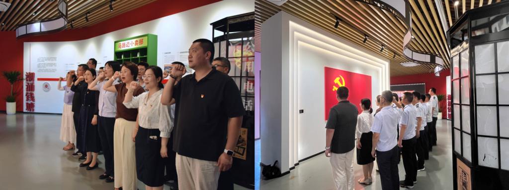 沿着青石板铺就的科同老街,大家先后参观了科同村数字党建故事厅、徐九斤电影乡村记忆馆、海宁珩瑆运河农耕文化民俗馆以及科同村文化礼堂等展馆。在数字党建故事厅宣誓墙鲜红的党旗下,全体党员郑重地举起右手,重温入党誓词,在铿锵的誓言中,大家的理想信念更加坚定。