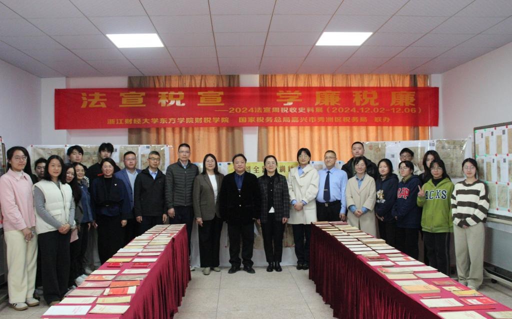 值此宪法宣传周之际,浙江财经大学东方学院伟德国际victor1946联合国家税务总局嘉兴市秀洲区税务局举办“跟着税收史料学税法”——法宣周税收史料展活动。活动启动仪式于12月2日下午举行。浙江财经大学东方学院纪委书记方咏、嘉兴市秀洲区税务局副局长陈建根、伟德国际victor1946党总支书记王影、海宁市税务局长安税务分局局长朱琼琪、伟德国际victor1946师生等共计30余人参加了启动仪式,伟德国际victor1946副院长刘央央主持了启动仪式。