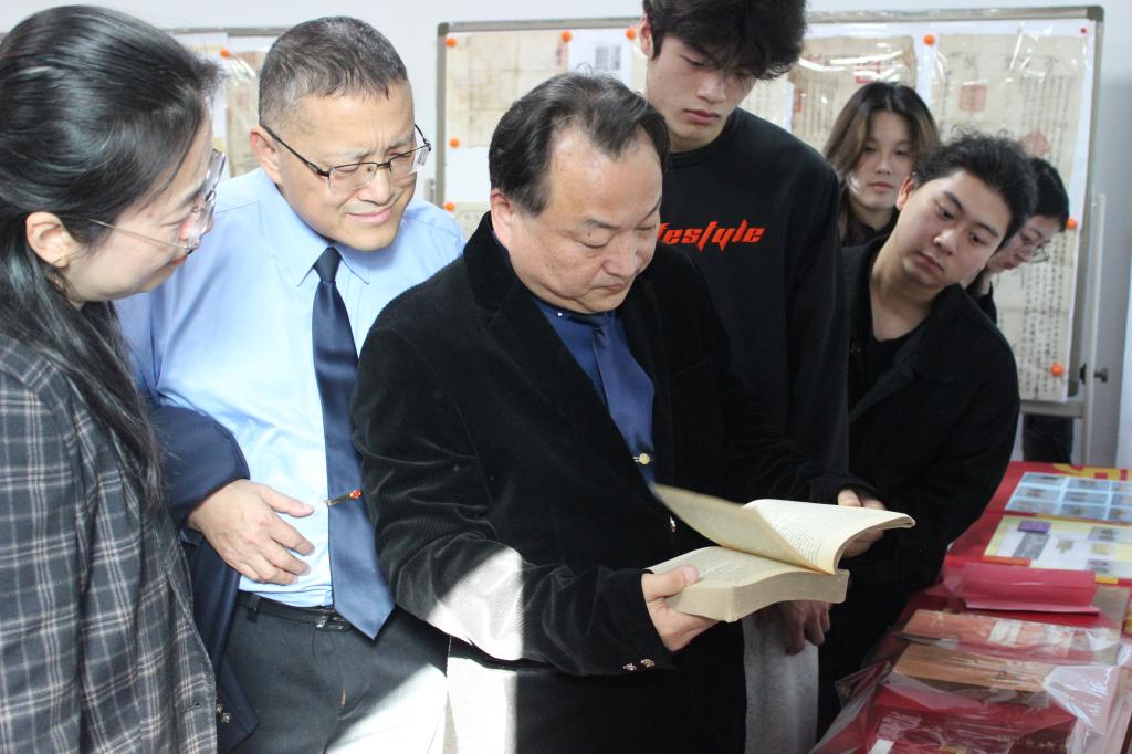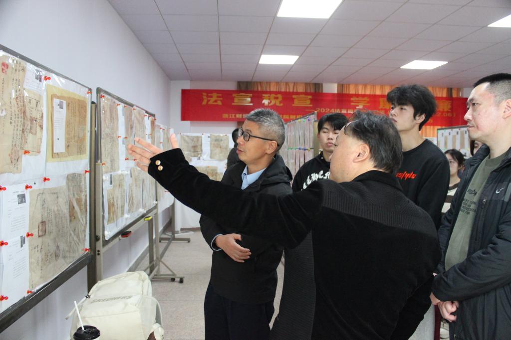 接下来联办方国家税务总局嘉兴市秀洲区税务局副局长,同时也是本次税收史料展展品收藏者、浙江嘉兴秀洲“建根脉”陈列室负责人陈建根发表讲话。他对本次史料展的前期筹备工作进行了介绍,并对本次法宣周史料展的文物“密码”进行引读,希望通过展出税收史料能够为学院师生专业学习提供历史思考。随后的捐赠环节,陈局长将自己收藏20余年的两本印花税相关书籍、一张清朝光绪年间的税收票证史料赠与学院,王影书记接受捐赠物品并表达了感谢。