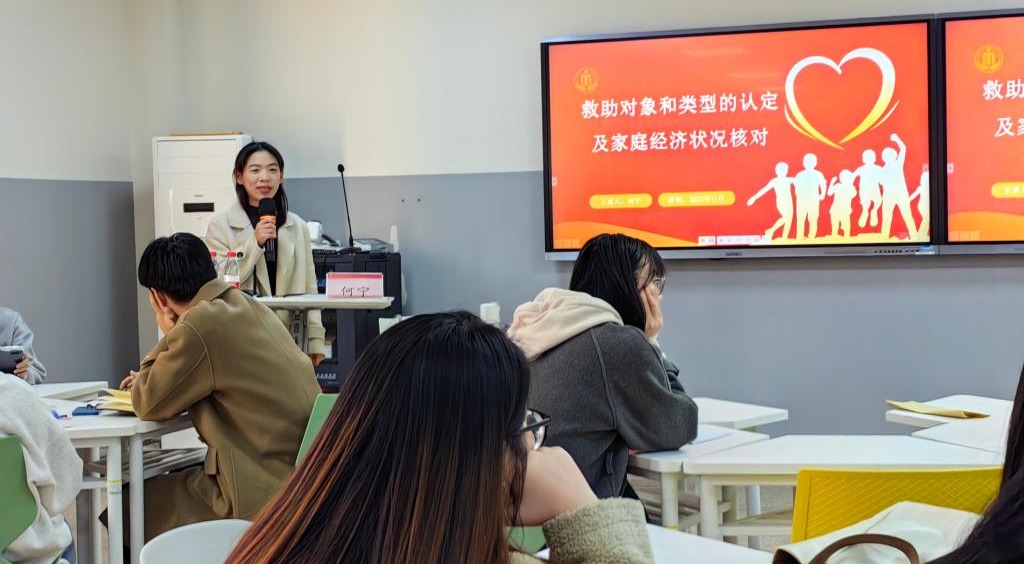首先,何宁老师以“海宁市社会救助1+8+X体系”为切入点,向同学们介绍了海宁市社会救助的基本的八项救助内容,让同学们对社会救助的整体框架有个初步认识。接着她分别以“救助对象认定”“救助类型认定”“家庭状况核对”以及“社会救助十大误区”四个方面来展开社会救助的基本介绍。她指出社会救助对象认定分别从户籍、共同生活的家庭成员、家庭收入、家庭刚性支出及家庭财产几个方面来进行;可以认定的社会救助类型主要有低保、低保边缘、支出型贫困以及单人户。