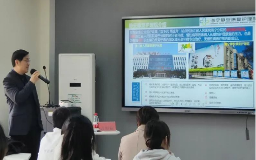 首先,江继镧介绍了静安康复护理院的概况,引出了海宁西片区“惠民、利民”的长期护理保险民生实事工程。江总指出,该项目的开展有效缓解了海宁市人民医院老年压床病人长期护理康复的压力,也填补了海宁西片区专业性长期护理事业的空白。