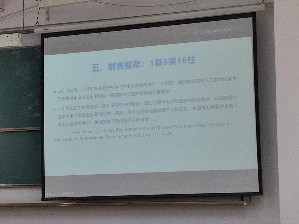 其次,戴卫东教授从制度定位和目前社会形势来分析“长期护理保险制度”建立的原因和重要性,提出“长期护理保险制度”是中国社会保险制度体系发展的新阶段和国家探索传统养老服务体制改革的开端。同时,他还总结了我国建立长期护理保险制度的六点基本原则和基本制度框架,让同学们对长期保险护理制度体系有了更深入的认识。