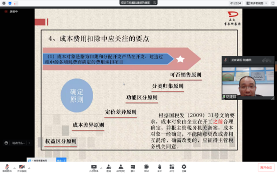 讲座开始,陆所长向同学们简要介绍了正确理解和运用增值税、企业所得税在制造业、房地产业的重要性,以及错误计算税费给企业带来的不利影响,提示可能存在的税收风险。紧接着,陆所长向同学们介绍了增值税、企业所得税的相关知识,如分类依据,计税方法,纳税义务发生时间,结算方式等。讲解过程中,陆所长对制造企业和房产业在不同环节的税收政策差异进行了详细介绍,结合实务,对各环节的注意点和易错点做了着重说明和提示。