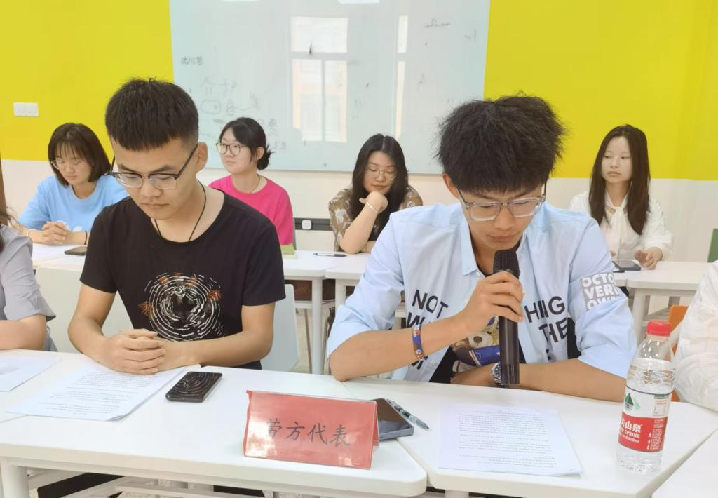 本次模拟集体谈判是指教师设定两个公司,学生分别扮演企业、工会以及政府相关角色,就工作过程中劳动者相关福利待遇、工作场所安全等议题开展谈判的过程,旨在训练学生运用理论与法律知识解决实际问题的综合实践能力。活动主要分为两场,第一场集体谈判发生在由姜子涵同学领导的福如特养老服务有限公司与工会代表之间,双方就提高护理员工资水平、护理员劳动技能要求以及配备设备三个核心议题展开了激烈的谈判。第二场集体谈判则发生在由周智娴同学领导的圣泽养老服务有限公司与工会代表之间,双方就平台推广员、软件开发工程师的相关薪资待遇、休息休假等议题展开。