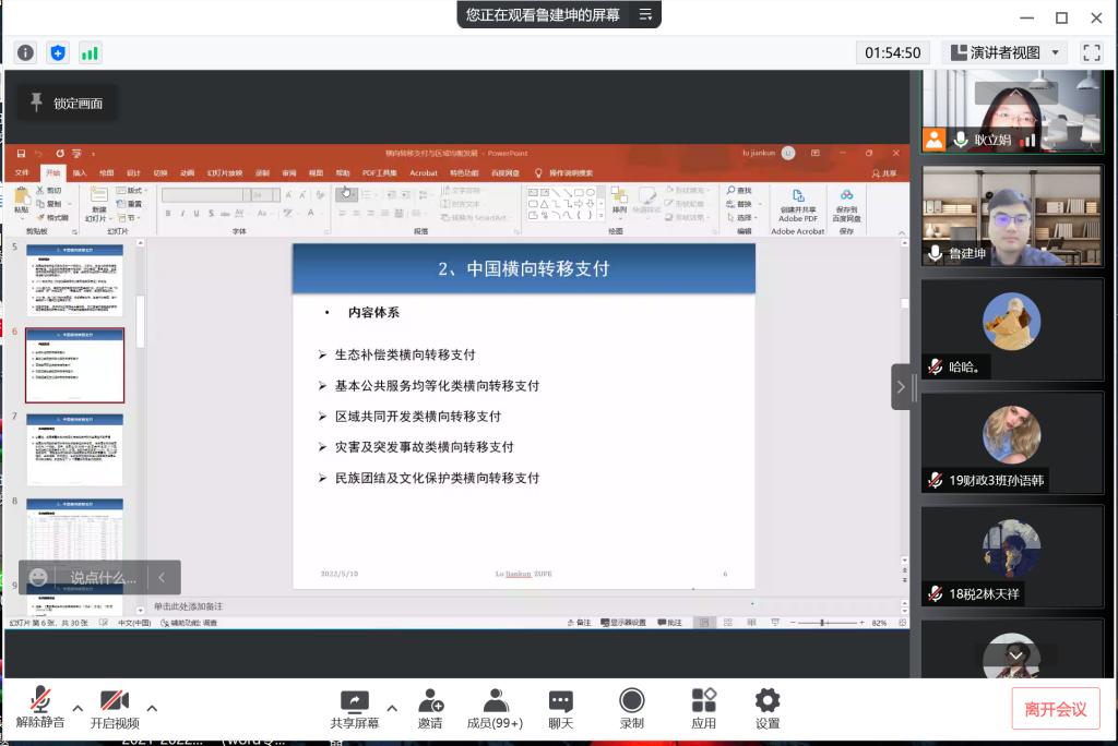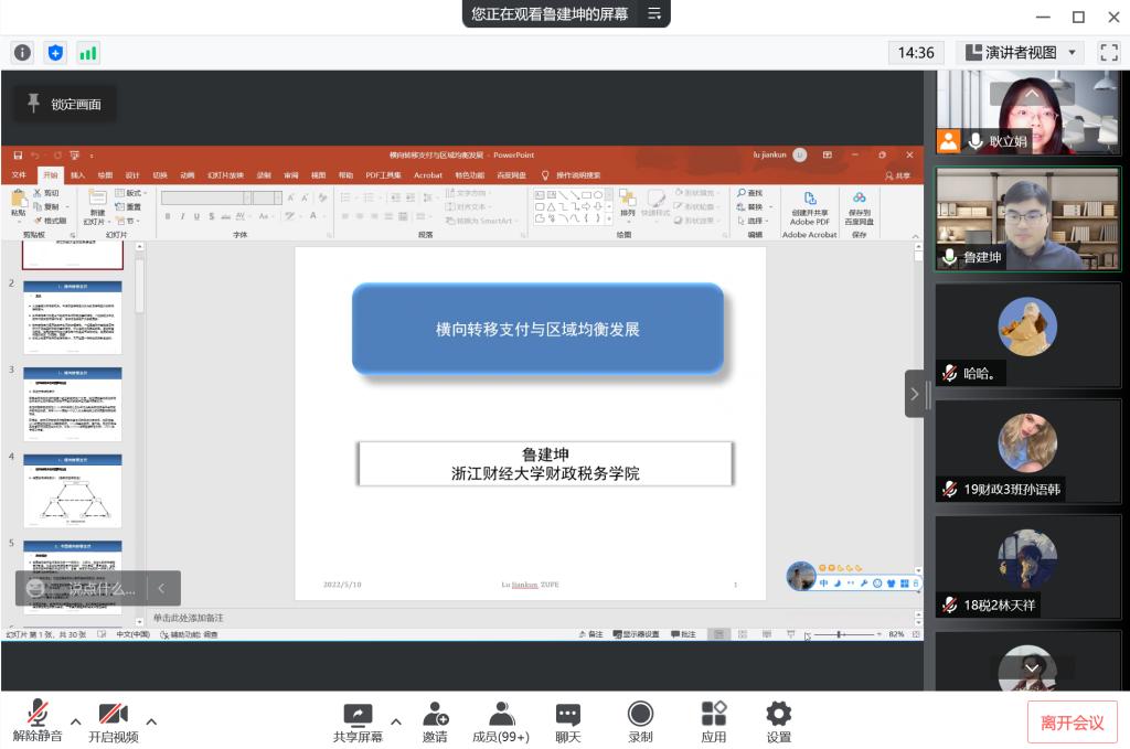 2022年5月10日14:00-15:30,伟德国际victor1946开展了“横向转移支付与区域均衡发展”主题讲座。本次讲座邀请了浙江财经大学财政税务学院鲁建坤副教授作为主讲人,并采用“腾讯会议”线上形式。2019级财政学、税收学专业各班同学踊跃参加了此次讲座。