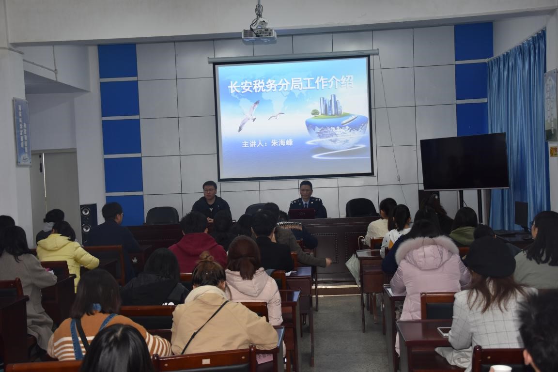在将90分钟的实践课堂上,朱股长依次介绍了长安税务分局的机构设置、纳税服务的举措、税收宣传的形式,“营改增”前后业务量对比、税务部门最多跑一次改革等内容,并结合自己多年的工作经历,为同学们介绍当前税务局工作的内容。