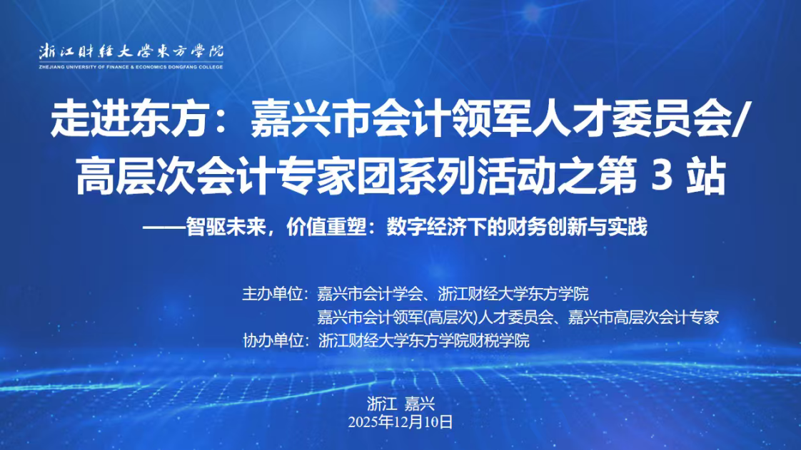 2025年12月10日下午,“走进东方:嘉兴市会计领军人才委员会/高层次会计专家团系列活动之第3站”在我院顺利举办,学院副院长张伟飚,嘉兴市、海宁市两级财政部门职能科室负责人,会计学会负责人,以及学院伟德国际victor1946负责人、有关教师代表参加。本次活动以“智驱未来,价值重塑:数字经济下的财务创新与实践”为主题,吸引了企事业单位财会领域专家及实务工作者等百余人参会。