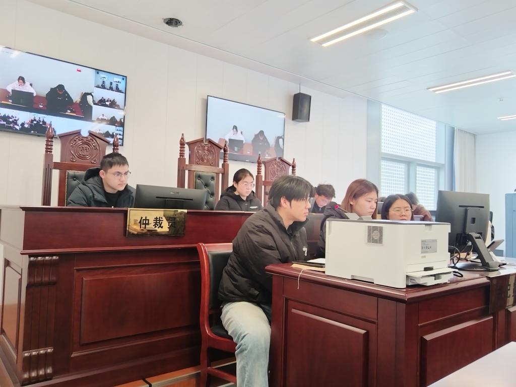 为让学生沉浸式参与庭审,活动依案件办理流程设置了仲裁员、当事人、委托代理人、书记员、调解员等不同角色。随着法槌敲响,模拟庭审正式开始。扮演仲裁员的学生有条不紊地推进庭审流程,依次完成调查、举证质证、焦点归纳与法庭辩论;双方当事人则在仲裁规范下积极陈述、据理力争;书记员同步跟进,完整记录庭审内容。被申请方围绕法律制度、事实依据与责任归属,有力地维护了己方立场。