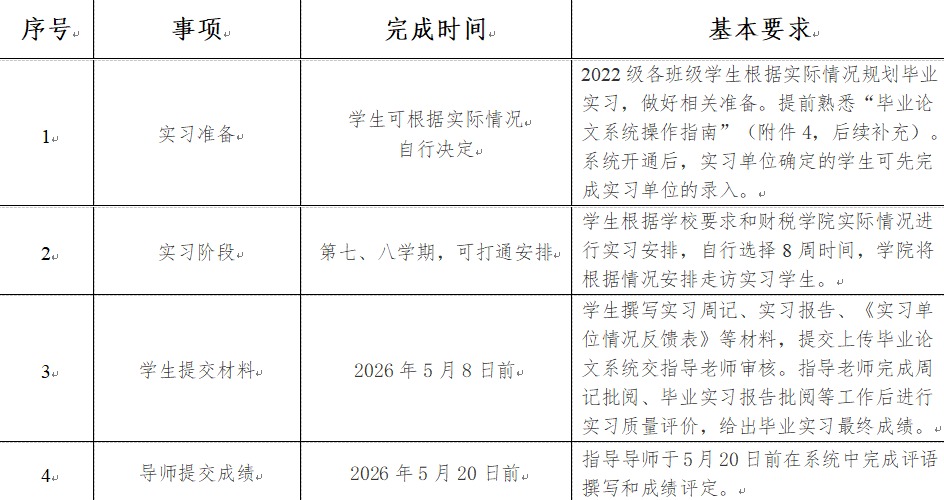 (5)实习周记、实习报告、《实习单位情况反馈表》等材料,最迟于2026年5月8日(校历第十周)前提交上传毕业论文系统交指导老师审核。