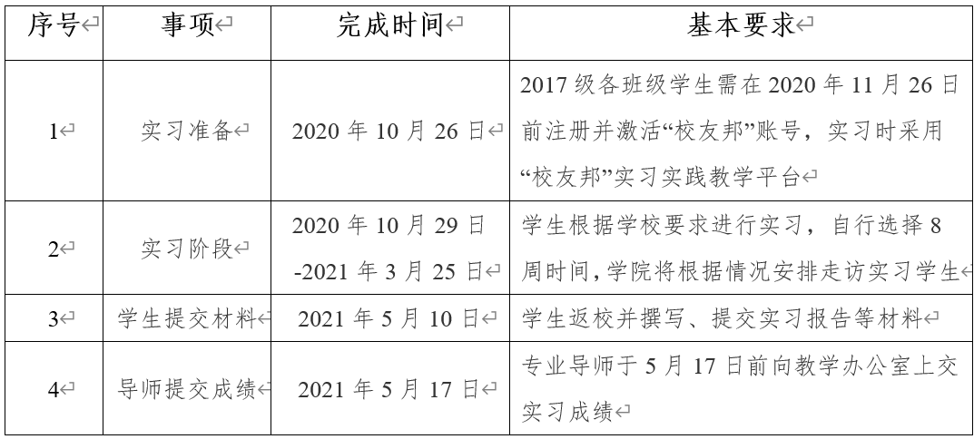 本次毕业实习采用“校友邦”实习实践教学平台。请指导教师通过“校友邦”实习管理系统检查学生实习情况指导实习,发现问题及时处理。请伟德国际victor1946各位专业导师按照上述规定时间进行指导。