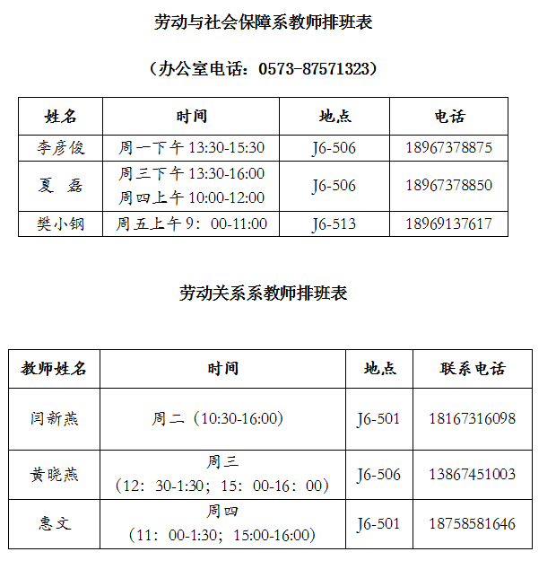 为方便学生与教师交流,财政系、税务系、劳动与社会保障系、劳动关系系分别安排教师本学期每周固定时间值班,安排详见附表。